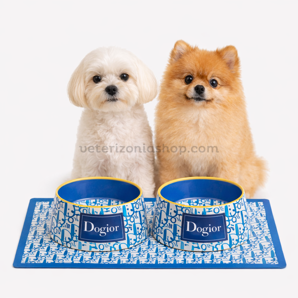 Set comederos Checker Chewy Vuiton – Premium 2 bowl BPA-free + mantel