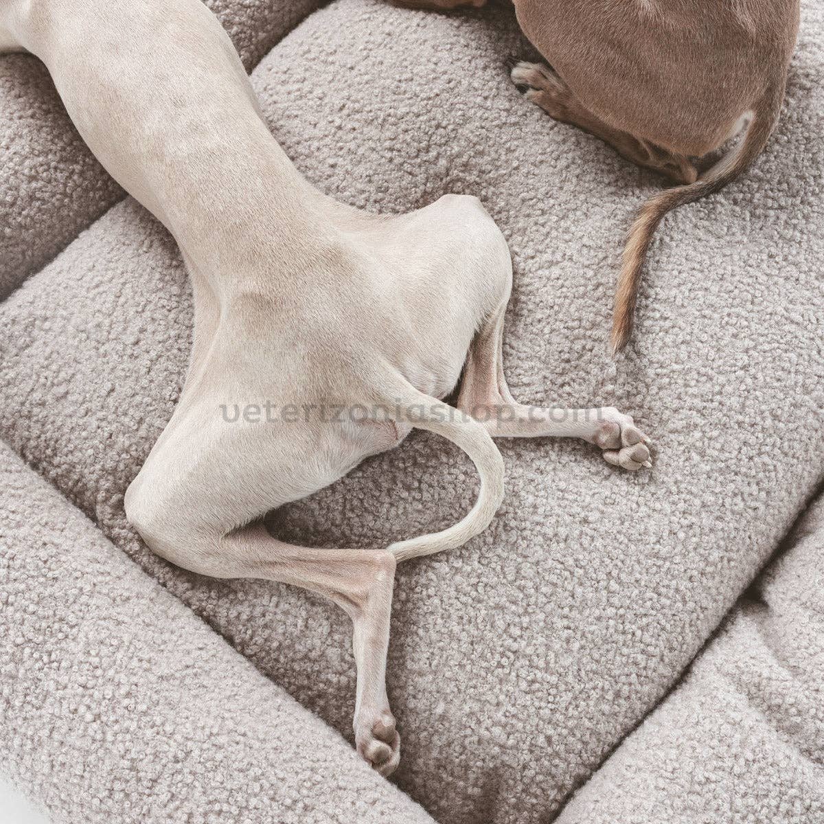 Además, el modelo Greige es completamente desenfundable, lo que facilita su mantenimiento y permite conservar la cama siempre impecable. La funda se extrae fácilmente mediante cremalleras ocultas, pensadas para no molestar al perro ni alterar la estética del producto.