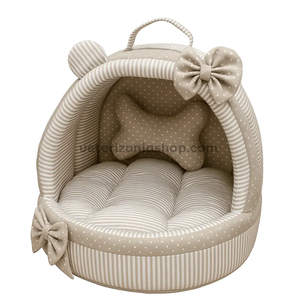 El interior forrado con rayas beige suaves crea una atmósfera acogedora y serena, ideal para mascotas que disfrutan del descanso en espacios tranquilos y protegidos. Su cojín reversible es todo un plus: por un lado, tejido suave tipo peluche en tono beige; por el otro, una superficie lisa que facilita su limpieza. Además, incluye una adorable almohada con forma de hueso, orejitas y lacito, un detalle único que enamora a primera vista.