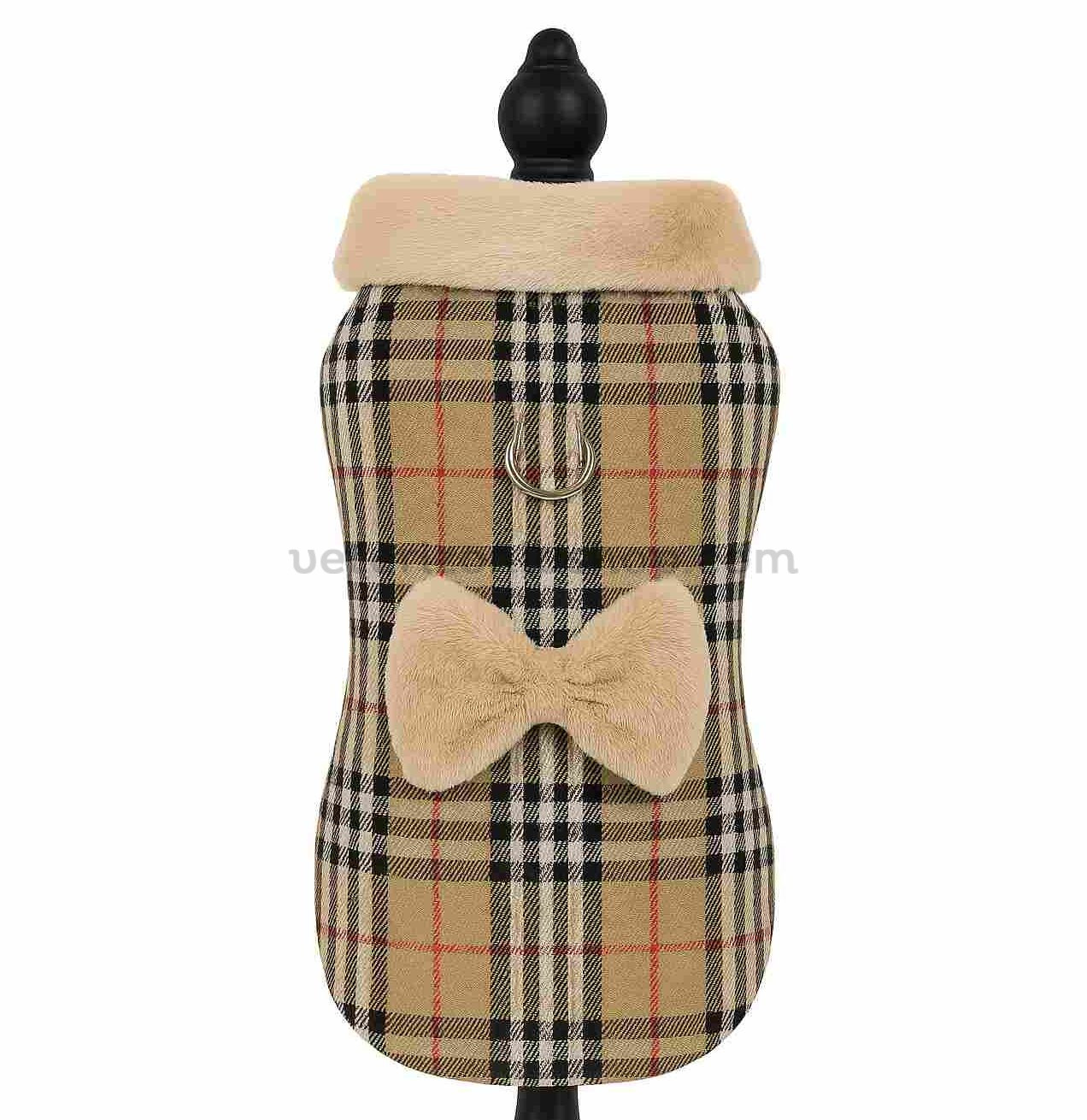 Abrigo Arnés Beige para Perro – Estilo Burberry con Lazo de Pelito y Anilla Plateada
