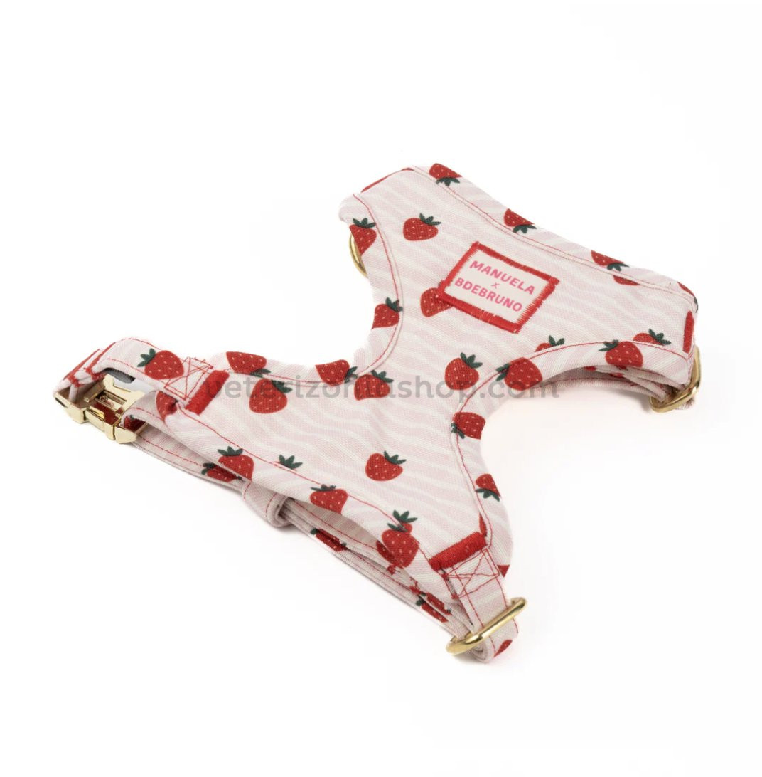 Arnés cómodo, ligero y ajustable con diseño de fresas. Ideal para paseos seguros y con estilo.
