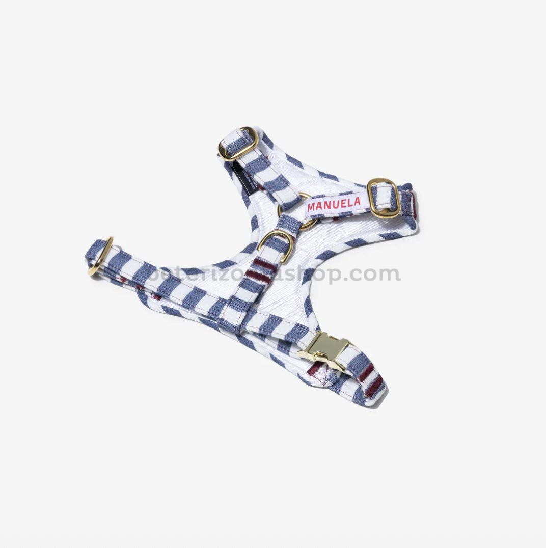 Este arnés para perro ajustable combina un diseño de rayas azul marino con detalle floral, ofreciendo una estética elegante y funcional para el paseo diario.